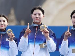 ‘세계최강’ 한국 여자양궁이 올림픽 단체전 10연패의 위업을 달성했다. 올림픽 3관왕인 ‘신궁'양궁에 찬사. 키다리 아저씨' 정의선 현대차그룹 회장이 단상에