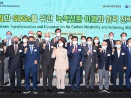 이달말 P4G 성공개최를 앞두고 "녹색 전환 속도 내자" 민관 환경단체 머리 맞댔다 한정애(앞줄 왼쪽 6번째) 환경부 장관이 20일 서울 여의도 글래드호텔에서 열린 국제 세미나에서 기념촬영을 하고 있다.