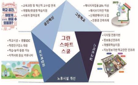학생‧교직원 참여 설계를 통한 공간혁신을 바탕으로 친환경 그린 스쿨, 디지털 기반 스마트 스쿨, 지역사회와 함께하는 학교시설 복합화 등을 종합적으로 반영한 그린 스마트 미래 학교를 구축한다.