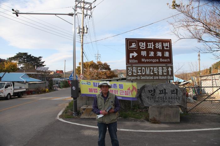 동해선 철도남북출입사무소 지나 해변을 돌아보았지만 철로는 보이지 않았다 남북 철도는 다시 이어지지는 않은 것이다. 민통선 따라 최북단 마을 명파리 마을을 진입하니 “동해북부선 간성역 선정을 희망하는 현수막”을 보게 되었다.(3년 전만 해도 고성 전망대를 가려면 명파리 최북단 마을로 지나갔다. 그러니 지금은 속초에서 곧바로 고성 통일전망대까지 고속화 도로가 생겨 명파리는 최북단 마을 이름에서 점차적으로 잊혀져 가고 있다)
