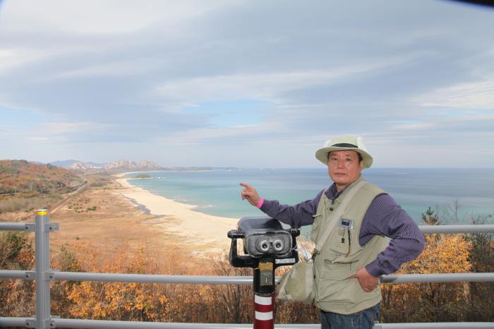 DMZ 넘어 북한 해금강을 가르키는 필자