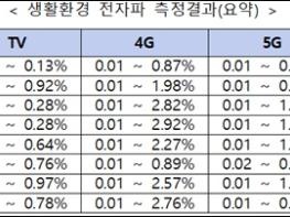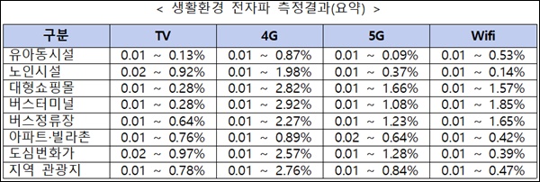 대표적인 전자파 방출원인 이동통신 기지국과 무선공유기, 방송국에서 측정된 전자파 세기도 모두 인체보호기준을 만족했다. 최근 수요가 늘면서 설치가 늘어났던 5세대(5G) 이동통신 기지국은 동일한 지점에서 측정한 전자파 세기가 인체보호기준 대비 최대 2%로, 최대 3%까지 측정된 4세대(4G) 이동통신 기지국과 비교해 낮게 나타났다. 지역별로는 어린이집이나 유치원, 초등학교와 같은 유아동시설에서 최대 0.87%로 가장 낮은 전자파가 발생했다. 노인시설, 대형쇼핑몰, 버스터미널, 관광지, 주거지역 및 도심 번화가도 3%를 넘어가지 않는 것으로 조사됐다.