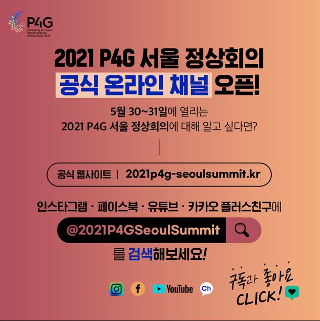 2021 P4G 정상회의 준비기획단(단장:유연철 외교부 기후변화대사) 2021 5 30()부터 31() 이틀에 걸쳐 서울에서 개최하는 ‘2021 서울 녹색미래 정상회의(2021 P4G* 서울 정상회의) D-70(3.21.)을 맞이하여 국민의 이해와 관심을 제고하기 위해 서울시청 광장에 카운트다운 시계탑을 설치한다고 밝혔다.