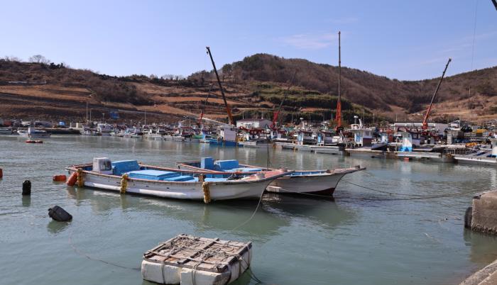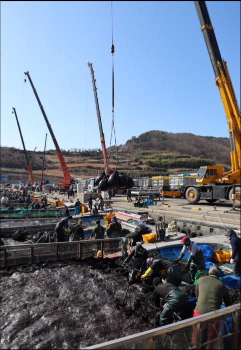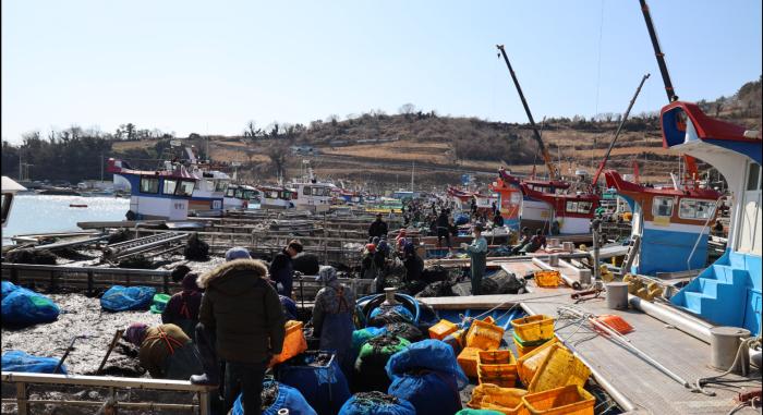2중 3중으로 말딛을 틈도 없이 김을 하차하는 선박들로 가득찬 발포항