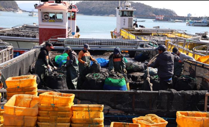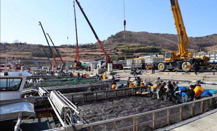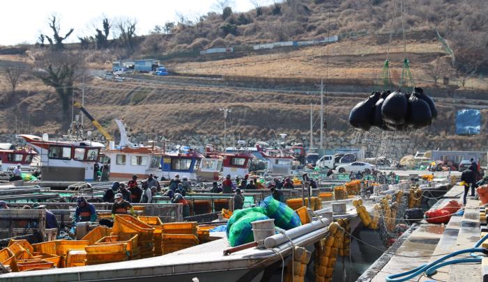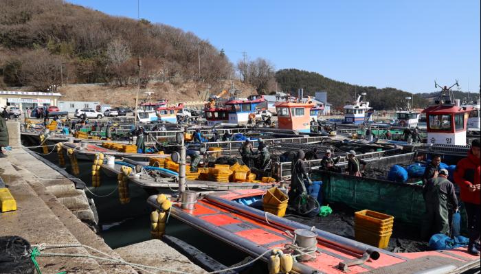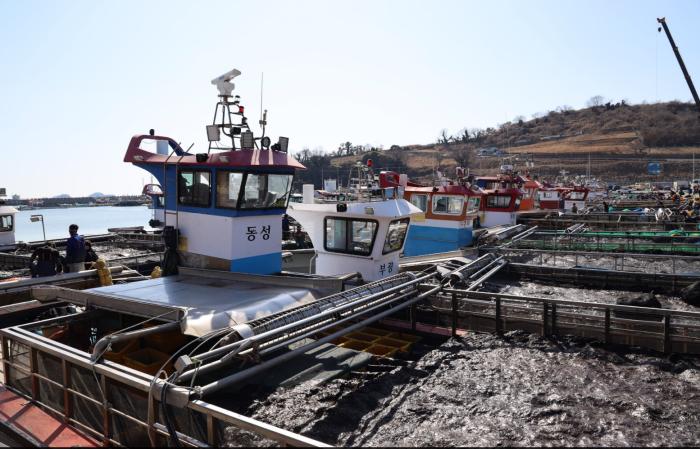 하차를 기다리는 김양식 선박들 발포항을 가득메우고 있다