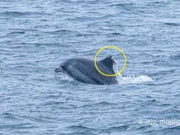 사진에서 남방큰돌고래는 등지느러미가 잘린 채 헤엄치고 있다.
