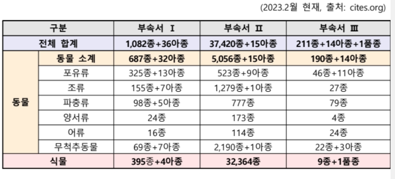 이번 목록 개정에 따라 부속서 Ⅰ(1,082종 36아종), 부속서 Ⅱ(3만 7,420종 15아종), 부속서 Ⅲ(211종 14아종 1품종)에 등재된 종은 총 3만 8,700여 종으로 나타났다.