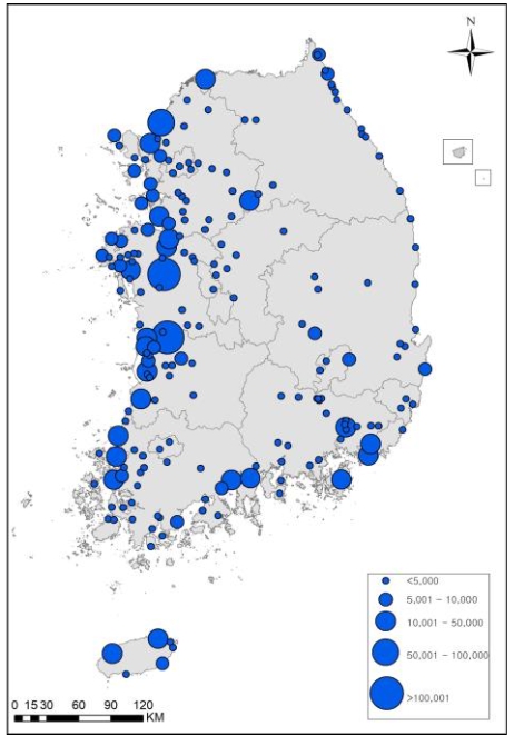 겨울철새 및 오리과조류는 금강호, 예당저수지, 임진강, 장항해안 등 중부지역에 집중적으로 분포했다.