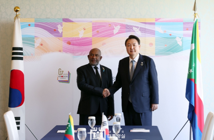 윤석열 대통령은 5. 21일 오전 히로시마 G7 정상회의 참석 계기에 아프리카연합(AU) 의장 자격으로 G7 정상회의에 참석한 아잘리 아쑤마니(Azali Assoumani) 코모로 대통령과 정상회담을 가졌다.