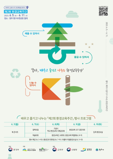 환경부는 6월 5일부터 11일까지 ‘제2회 환경교육주간’을 운영한다. 올해 행사는 기후위기와 플라스틱 오염 해법을 주제로 다양한 기관들과 협력하여 전 국민이 환경교육을 즐겁게 배우고 나눌 수 있도록 다채로운 환경교육 기회를 제공한다.