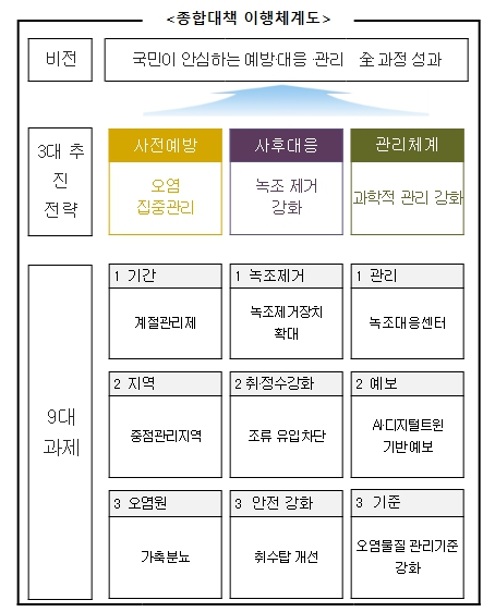 류연기 환경부 물환경정책관은 “올해에는 야적퇴비 제거 등 가축분뇨 관리를 중심으로 비상대책을 추진하여 단기간 내 효과적으로 녹조를 저감할 것”이라며, “이와 더불어 근본적인 녹조 저감을 위한 중장기대책도 동시에 추진하여 녹조로부터 안전한 물환경을 조성하겠다”라고 밝혔다.