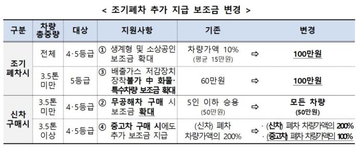 민생경제 안정 등을 위해 생계형(기초생활수급자·차상위계층) 및 소상공인 차주에 대한 보조금 추가 지급(100만 원 이내)과 기존 차량 폐차 후 무공해차(전기차·수소차) 구매 시 추가로 지급하는 보조금(50만원)은 그대로 유지된다.