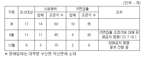 이번 조사는 그간 석면함유 조경석 판매로 문제가 발생한 충북 제천시 지역 내 전체 조경석 판매업체를 대상으로 작년 4월, 12월 두 차례 실시했으며, 석면이 검출된 조경석에 대해서는 판매 금지명령 등 조치를 진행했다.