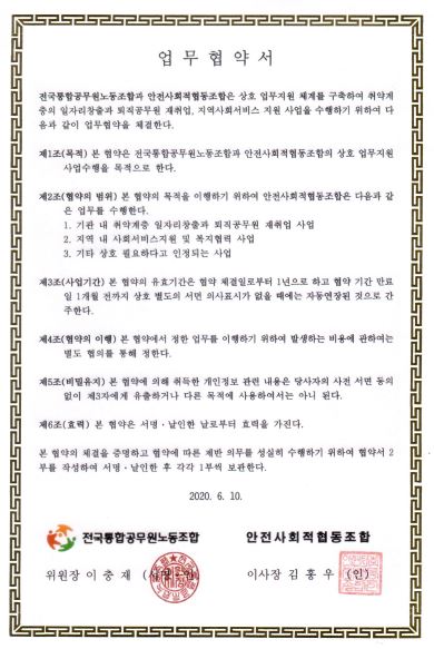 전국통합노동조합 이충재위원장은 지난 10일 노동조합사무실에서 안전사회적협동조합 김홍우이사장과 학교업무와 교육연수 업무지원협약을 체결했다.