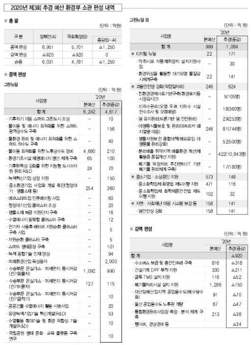 그린뉴딜 사업으로는 스마트 상하수도 구축 사업(196억 원), 전기 화물차·이륜차·굴착기 보급 사업(1,115억 원), 미래환경산업 육성융자(2,000억 원), 환경기초시설 재생에너지 생산(100억 원) 등 4,617억 원이 증액됐다.